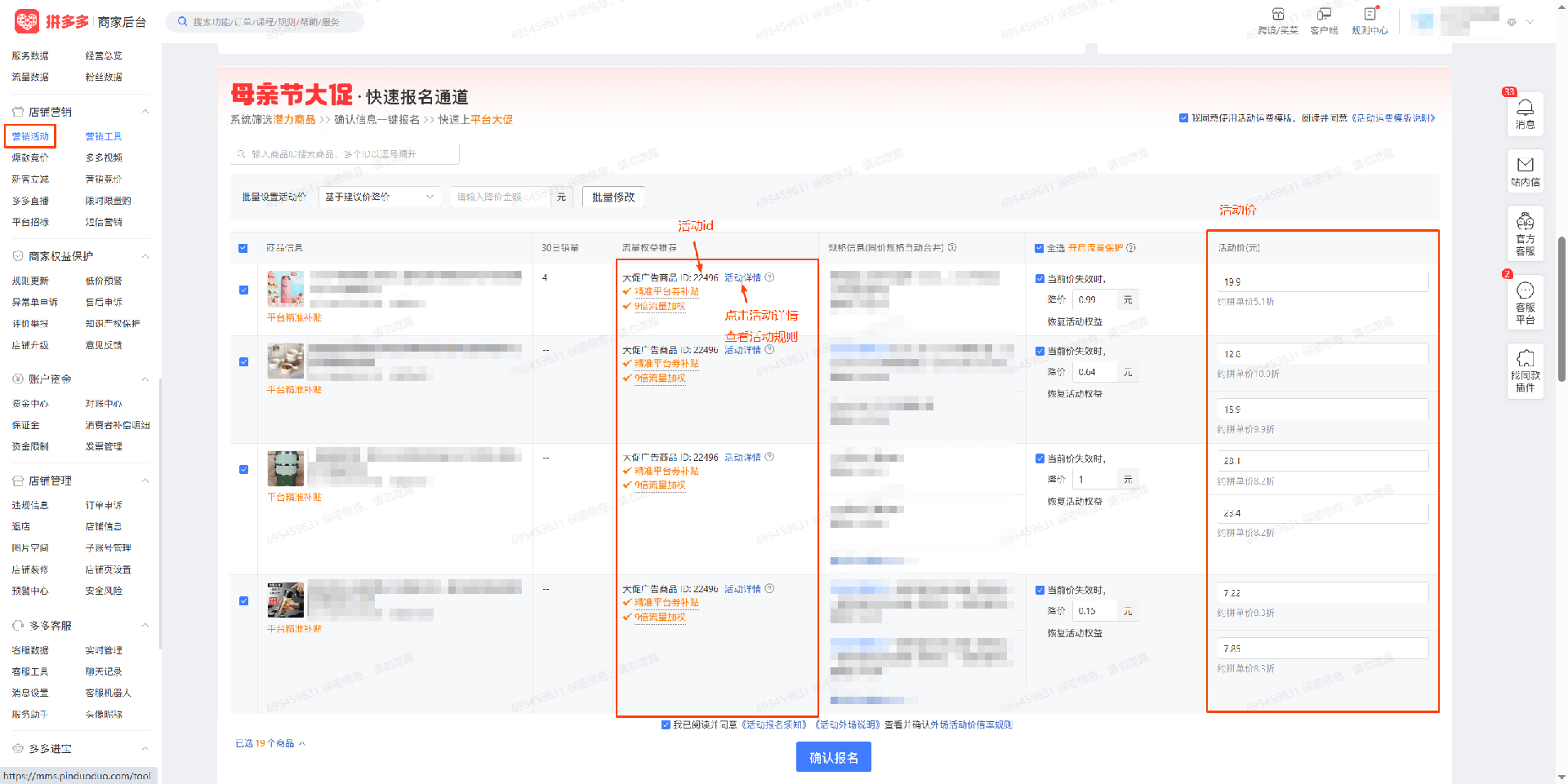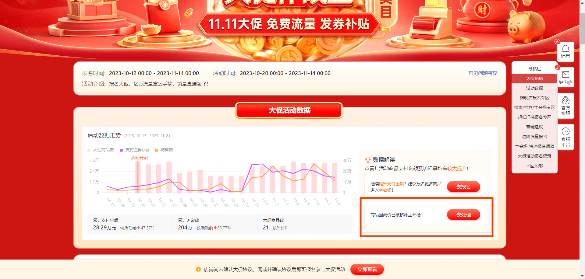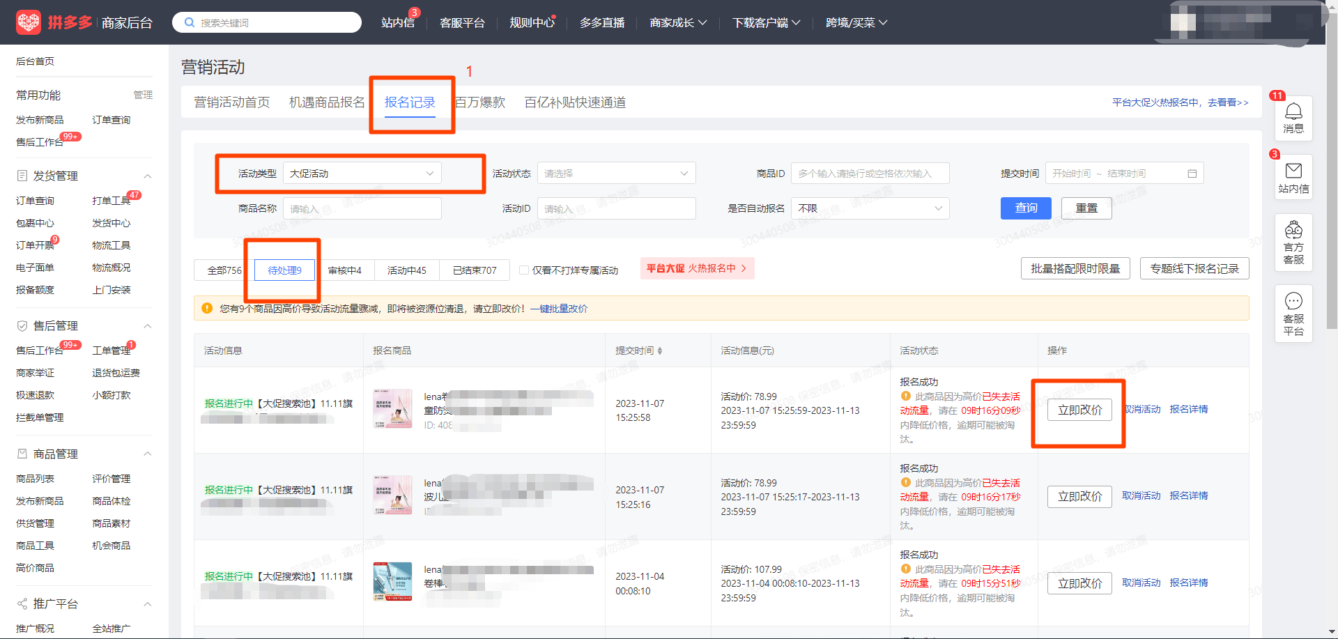 2、营销活动中心,【报名记录】处找到【大促活动】,【待处理】信息中【立即改价】