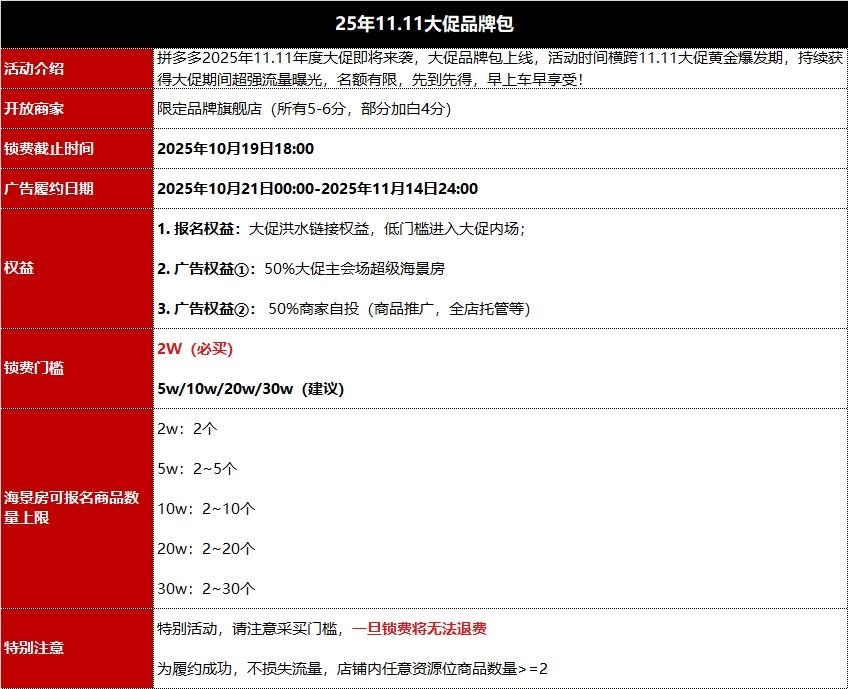 2025年拼多多11.11年度大促即将来袭!同往届一样,在S级大促期间,受邀品牌旗舰店商家可通过购买大促品牌包来获得洪水链接报名权益,超低门槛进入大促内场!