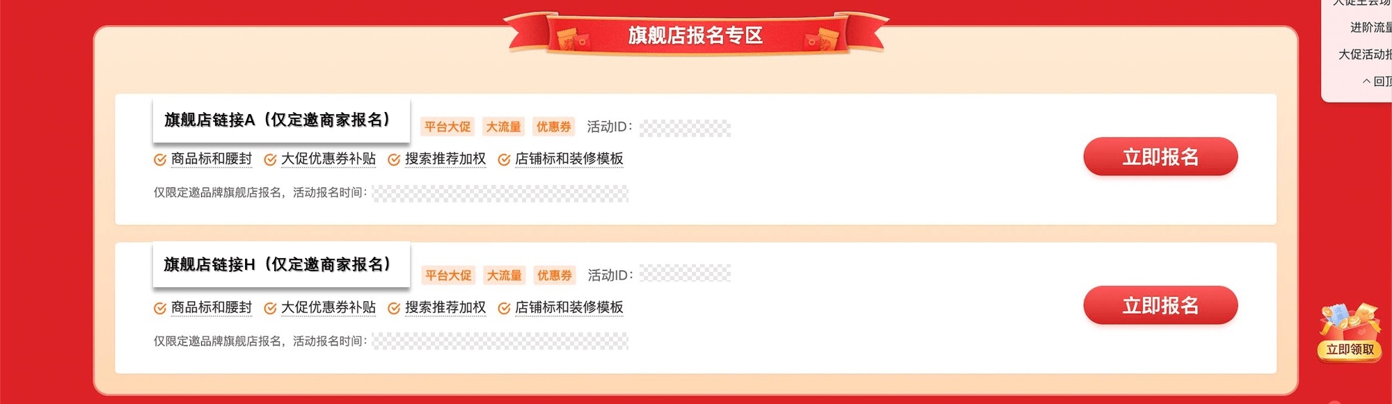 ***大促品牌包锁费、官微置换都完成后,满足条件的店铺,*迟T+1天可在【大促作战室】报名【洪水链接】,如下图示意: